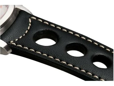 - Ce bracelet en cuir de veau noir surpiqué Ecru est fabriqué à la main en Belgique. Son design aéré ajoute une touche sportive à la montre et vous fait ressentir un véritable esprit de course automobile.