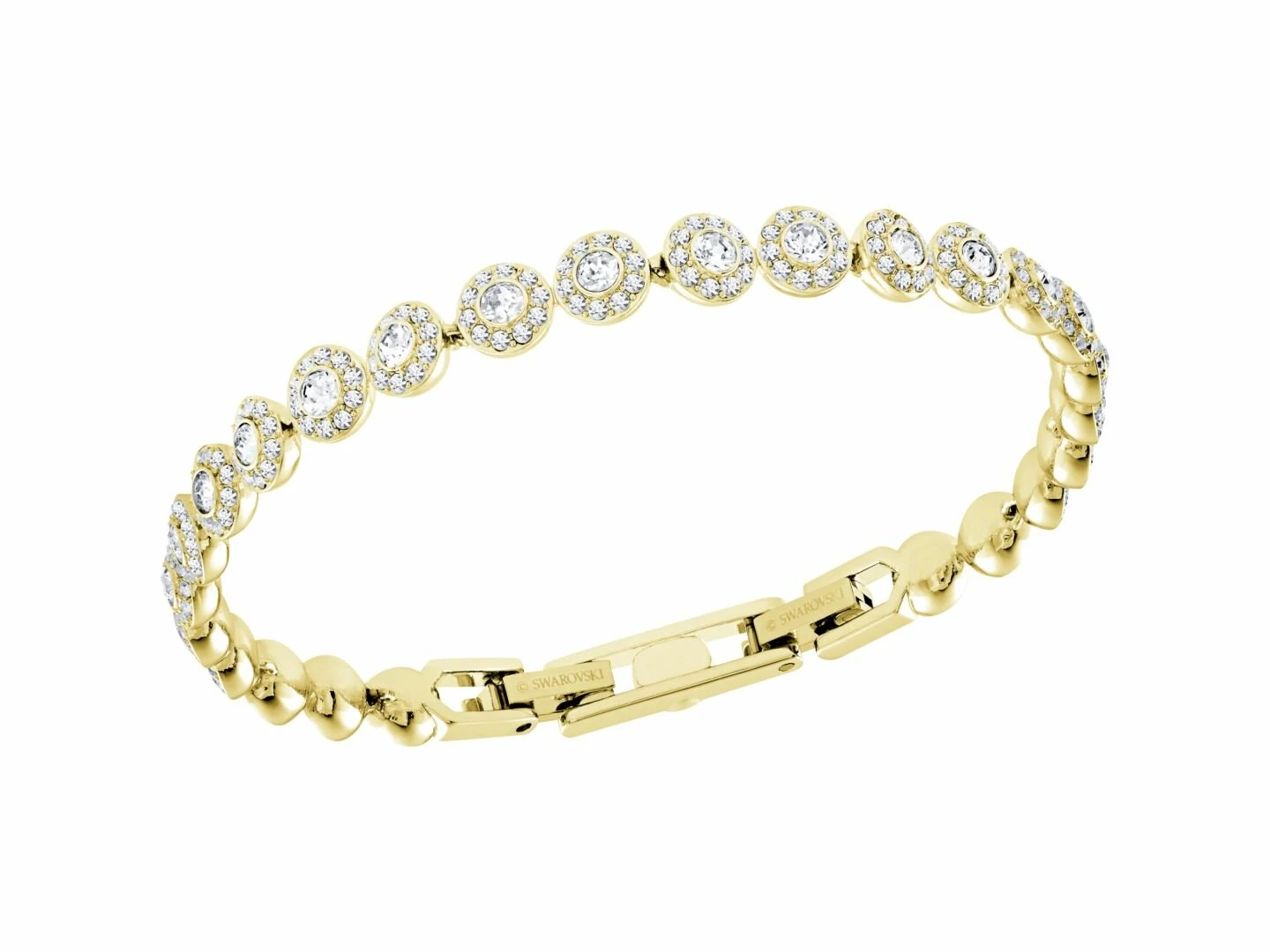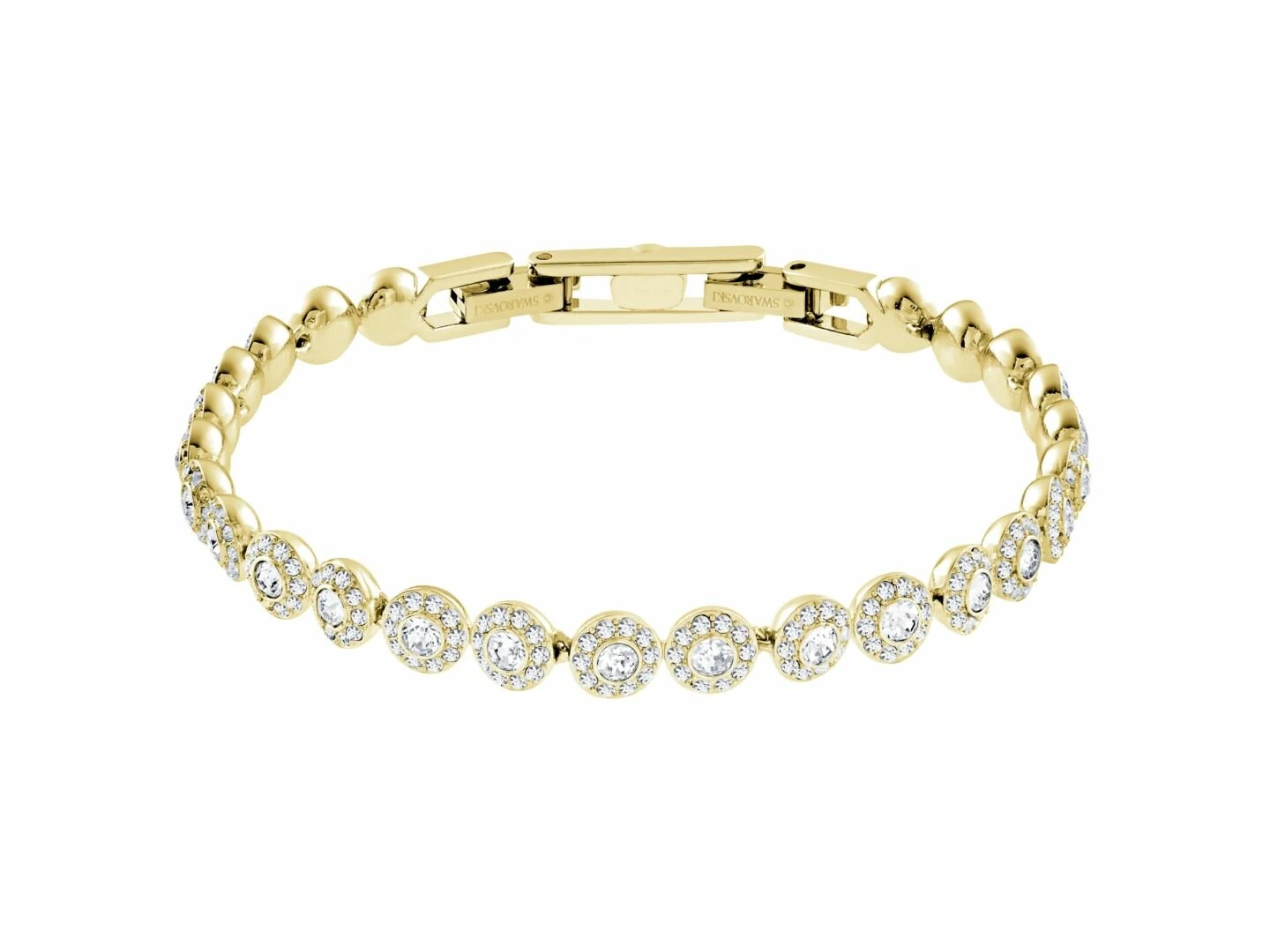- Une sophistication pure et intemporelle. Ce bracelet en métal doré arbore une rangée de cristaux incolores ronds, chaque cristal étant entouré dun pavé de cristaux incolores étincelants. Saccordant parfaitement avec dautres bijoux de la ligne Angelic, il fera un cadeau somptueux.